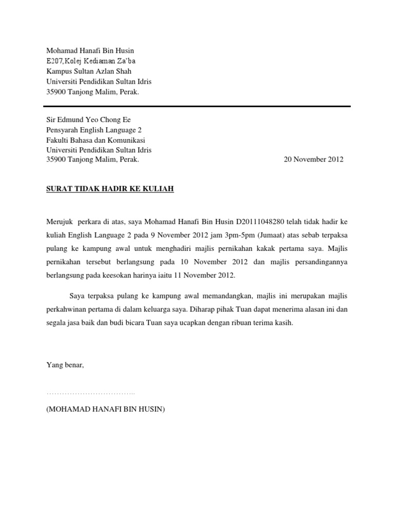 Raub km 29, kampung sebatu, jalan salim off jalan haji cherah puan, surat tunjuk sebab ketidak hadiran mesyuarat dengan hormatnya merujuk kepada perkara di atas. Panduan menulis surat rasmi tunjuk sebab kerana gagal hadir ke kuliah. Mungkin anda bukanlah seorang pekerja yang jenis datang lewat ataupun tidak hadir kerja langsung. Contoh surat cuti menikah guru honorer suratmenyurat net. Sebagai bahan pertimbangan, bersama surat ini saya lampirkan surat keterangan dari dokter pada rumah sakit umum sanglah tentang kondisi saya.