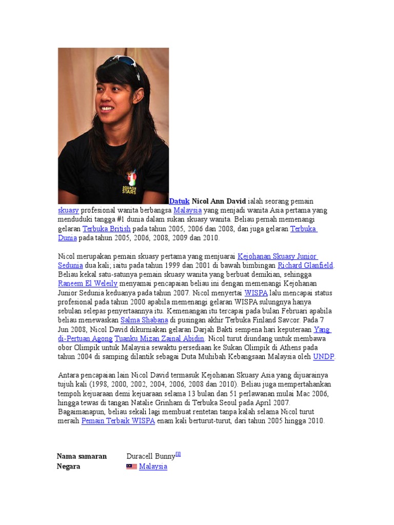 Related : Kejayaan Nicol Ann David - Datuk nicol ann david (born 26 august 1983) is a malaysian female professional squash player..
