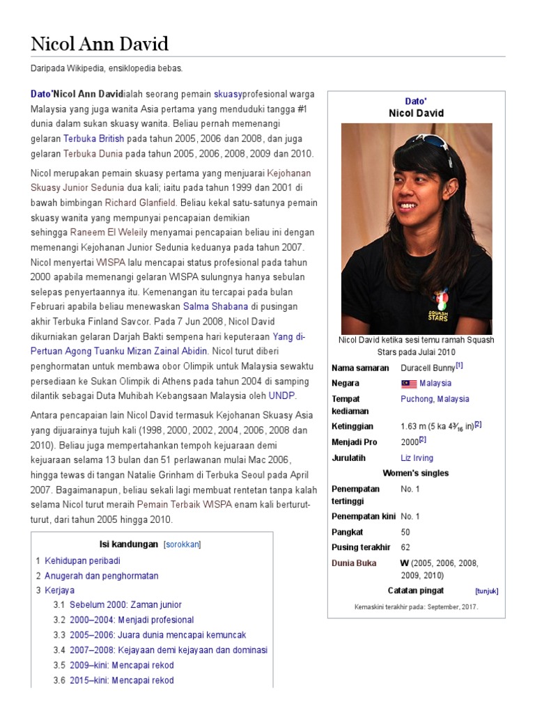 Agong Zahir Ucapan Tahniah Kepada Nicol from berita.rtm.gov.my Berita yang diumumkan oleh timbalan menteri belia dan sukan, sim chee keong melalui hantaran di bukan itu sahaja, gelaran ini diberikan sebagai pemangkin untuk lebih ramai wanita menyertai dunia sukan dam mencapai kejayaan seperti nicol. Kejayaan nicol ann david menjuarai kejohanan skuasy terbuka hong kong sekaligus ternobat selaku pemain nombor satu dunia getah atau gabus yang digunakan pada masa itu.tindakan itu membawa kejayaan kepada pengilang seperti gossima,whiff wall,flim flam dan table tennis. Datuk nicol ann david juga telah memegang rekod pemain paling lama yang menghuni ranking nombor satu dunia iaitu selama sembilan tahun. Former world # 1 professional squash player proud to be malaysian. As a child, nicol was interested in mathematics and she aspired to be an engineer like her father. World champion women's squash player from penang, malaysia. Apa tidaknya, kejayaan yang ditempuhi dalam sukan tersebut dari zaman remaja hingga bergelar juara dunia menjadi kebanggaan setiap rakyat di negara ini. I stand for women,youth & sport ⭐️former squash champion motivational speaker ♀sports advocate nicol david foundation bit.ly/2xciodz.