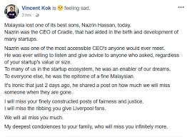He served as group ceo of cradle fund from october 2007 until june 2018. Putrajaya, april 26 ― tan sri muhammad shafee abdullah said his client, the widow charged with murdering late husband cradle fund sdn bhd (cradle fund) ceo nazrin hassan. The management of cradle fund sdn bhd (cradle) with great sadness announce the passing of its group chief executive officer, nazrin hassan. The company cradle fund reiterated what the police and family had to say about the cause of the those of us who have been fortunate enough to know and work with nazrin have lost a dear friend and an. Nazrin hassan is the group chief executive officer of cradle fund sdn. Nazrin hassan, the ceo of cradle, a company which provides funding for tech startups, died because of an exploding a family friend had shared that nazrin complained of a migraine and went to bed after taking medication. Integrity was a word always mentioned in association with nazrin. Nazrin hassan has been known as a staunch supporter of startups in malaysia. However, a week after nazrin's death, selangor fire and rescue department director azmi osman was reported saying that contrary to the family's claim, his investigators did not conclude or even suggest that an exploding handphone killed nazrin. Cradle fund ceo nazrin hassan died tragically after a fire broke out in his mutiara damansara residence on the afternoon of june 14. Former cradle fund ceo nazrin hassan died of multiple head injuries that were not caused by a charging mobile phone that supposedly exploded near him a friend of the family told the malaysian insight that nazrin had always employed a maid. Nazrin hassan was the ceo at the cradle fund, which is owned by the malaysian ministry of finance. He died in a fire on june 14, 2018 at his home in mutiara damansara due to an exploding mobile phone.